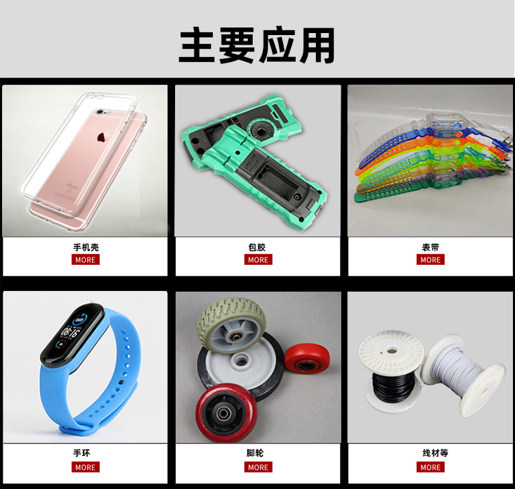 應用領域:電子產品護套,鞋材,共混改性,腳輪,管材,包膠等。